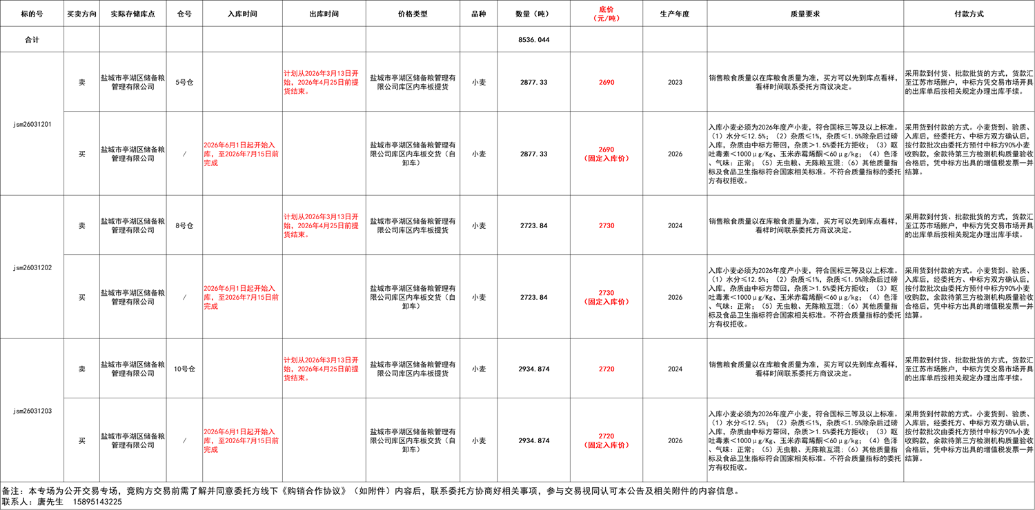 本次交易采用購銷雙向競價(以采競銷)模式,即委托方與競價方通過一次交易同步實現(xiàn)同等數(shù)量糧油的采購和銷售。以采競銷模式下,競價參與方只對銷售標(biāo)的底價進行競價,一旦銷售標(biāo)的物應(yīng)價成交,則相應(yīng)采購標(biāo)的物以交易清單中公布的價格成交,銷售價格以競價交易結(jié)果為準(zhǔn)。通過一次交易實現(xiàn)購銷雙向交易。競價參與方須仔細閱讀本交易公告、清單、線下購銷合作協(xié)議及其他相關(guān)文件,謹(jǐn)慎評估自身風(fēng)險承擔(dān)能力和市場、政策風(fēng)險,衡量決定是否參與交易,一旦參與,須承擔(dān)相應(yīng)的風(fēng)險和責(zé)任,自覺履行相關(guān)義務(wù)。中標(biāo)方須保證輪出糧食流向符合國家有關(guān)規(guī)定,并不得用作中央和各級地方儲備小麥的輪入,否則一切法律和政策責(zé)任全部由中標(biāo)方自行承擔(dān)。